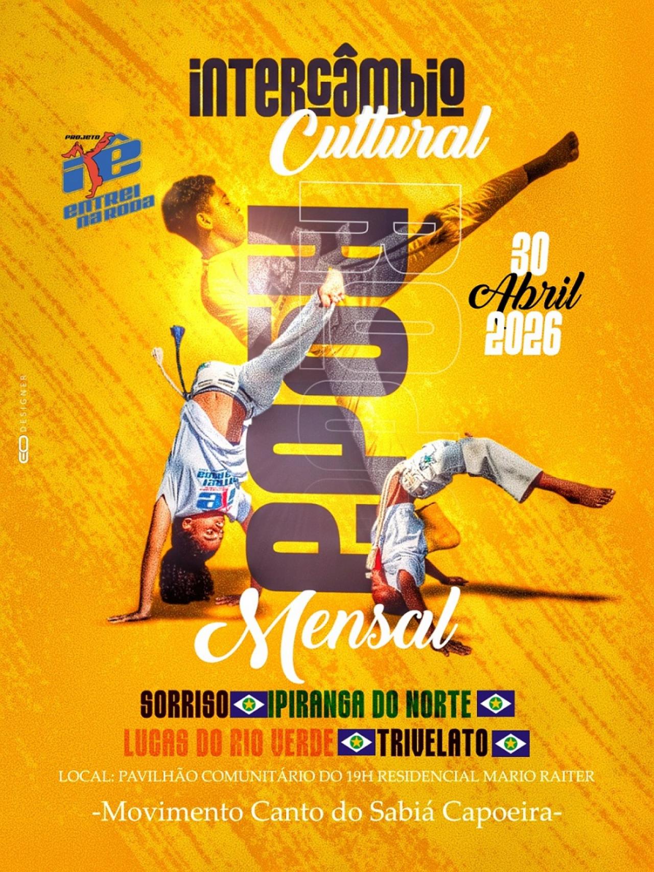A comunidade de Sorriso está convidada a participar de uma noite dedicada à cultura, tradição e integração por meio da capoeira. O projeto “Iê Entrei na Roda”, desenvolvido pelo Movimento Cultural Canto do Sabiá Capoeira, realiza nesta quinta-feira, dia 30 de abril de 2026, às 19h, um intercâmbio cultural com roda aberta ao público.